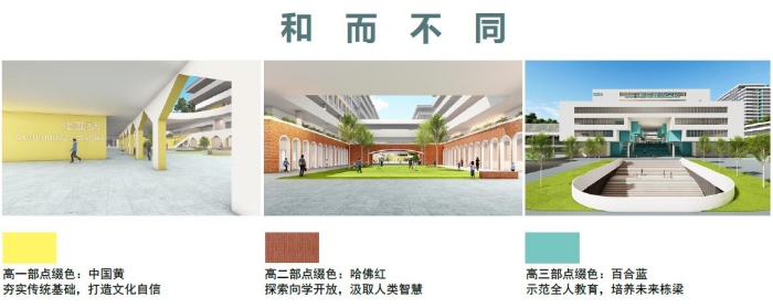 同時將不同年齡段的學生劃分了三個校區,通過中國黃、哈佛紅、百合籃不同的顏色點綴區分,使得東方和西方文化的融合,育百合新人,整體統一確自由特色,達到“和而不同”。