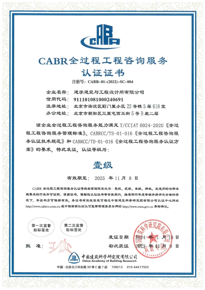 建學建筑與工程設計所有限公司(以下簡稱“建學公司”)于2022年獲得CABR全過程工程咨詢服務認證貳級證書,2023年度CABR全過程工程咨詢服務認證外審綜合評分滿足一級要求,認證級別由貳級成功升為壹級。