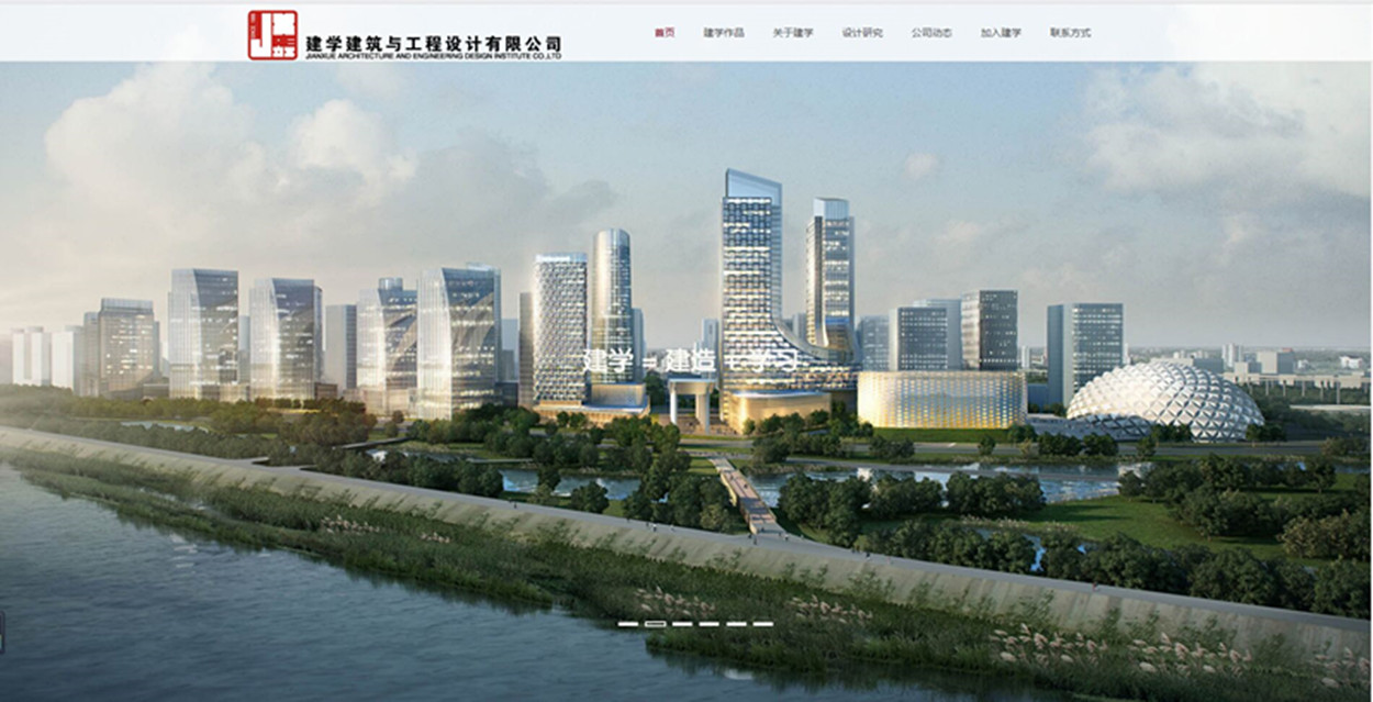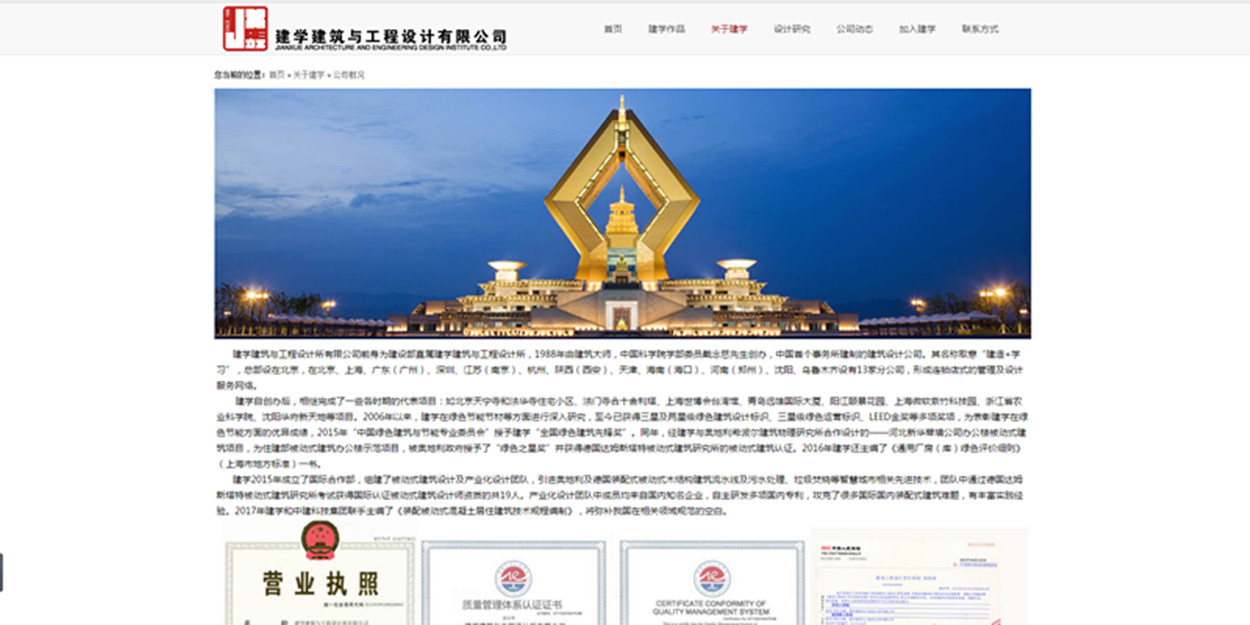 內容上,我們在公司網站首頁及各個頁面,選取了近幾年可以代表建學的項目作品,更新了公司簡介、公司執照、獲獎情況,對加入我們欄目進行了修改,從培訓、出國考察、工會活動、工作環境四個方面進行了介紹。新增了建學學術欄目,其中對建學叢書、綠色建筑、裝配式建筑、被動式建筑、物流專項等建學特色進行了介紹,上傳了一些都代表性的文章,展示了建學在這幾個方面的建樹。在項目展示中,我們根據自身特點,增加了被動式建筑、裝配式建筑、特色小鎮、電鍍廠項目等。 下圖為公司簡介效果圖
