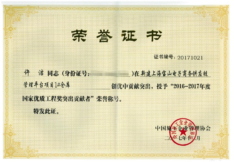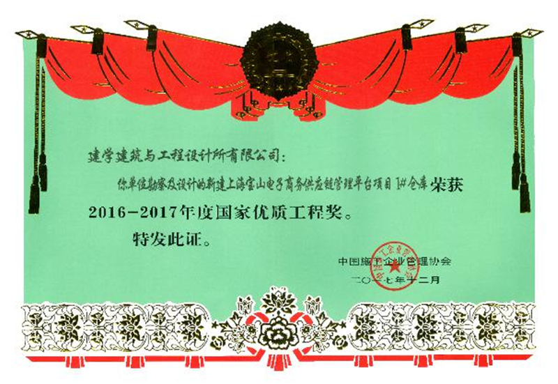 我公司設計的“新建上海寶山電子商務供應鏈管理平臺項目”在連續獲得2015年度上海市文明工地、2016年度上海市優質安裝工程及2016年度上海市建設工程“白玉蘭”獎(市優質工程)后,近日又獲得中國施工企業管理協會頒發的2016-2017年度國家優質工程獎,同時,我公司許潔工程師因其突出貢獻獲得“2016-2017年度國家優質工程獎突出貢獻者”稱號。
