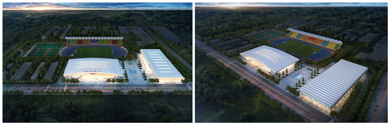 隱匿鋼結構,通過金屬屋面簡約而有力地去表達體育建筑的空靈與運動瞬間的輕盈。獨立完整的通過建筑體量去占據城市空間來體現絕無僅有的城市理想與建筑美感。建筑采用通用度比較高的張懸拱結構形式經濟的實現了設計意愿。通過鋼結構與金屬屋面材料形成獨立的小型舞動單元,通過單元與單元之間的連接舞動來彰顯體育運動的動態美與團隊協作精神。標準化的單元降低了屋面整體的體量與尺度,使其和諧的融入城市公共空間。標準化的單元構建適應工廠的快速加工與構建標準化,集約化的解決了城市形象與經濟投入的問題與矛盾。通過靈動的組合建筑意向體現武功未來城市的夢想…… 以下為效果圖