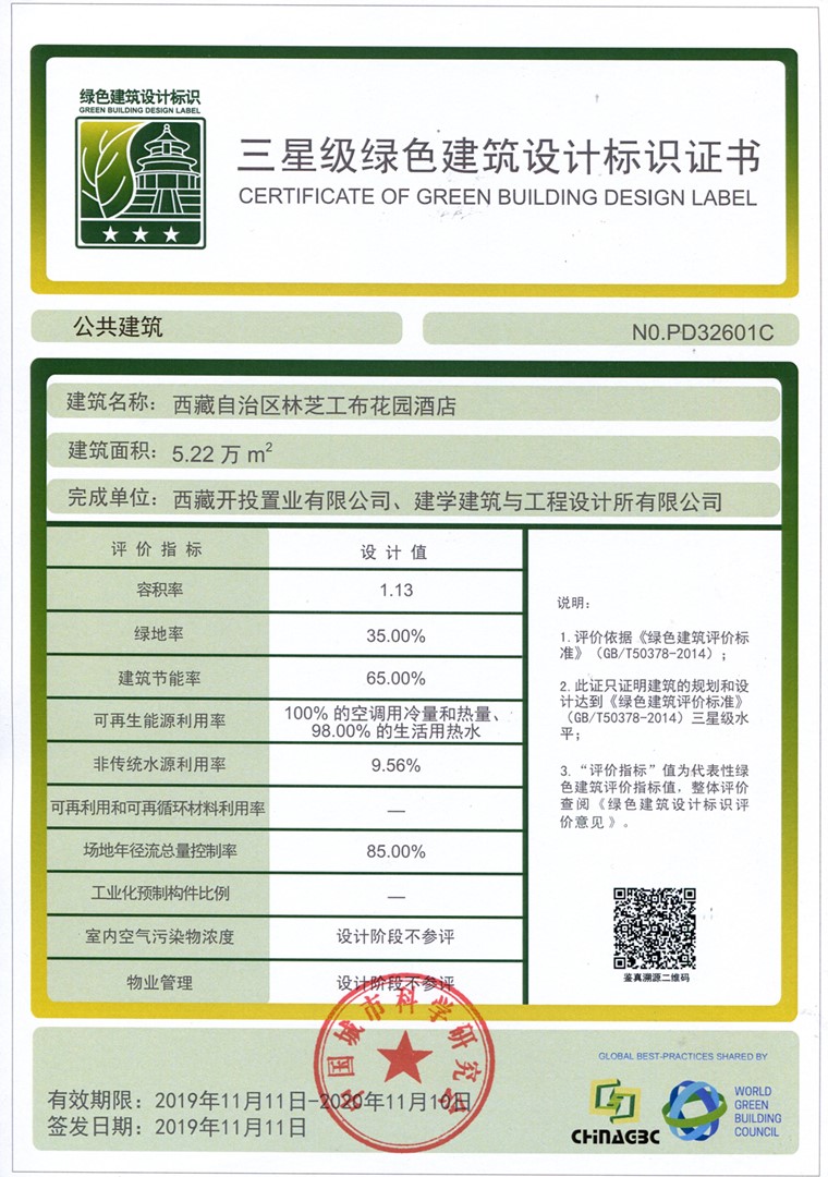 西藏自治區(qū)林芝工布花園酒店取得三星級綠色建筑設(shè)計標(biāo)識證書 |