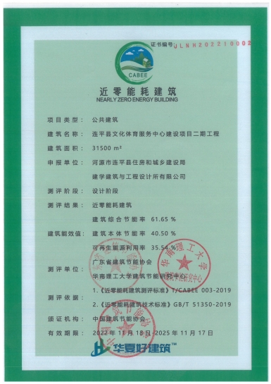由建學完成設計的三個項目“中建科工惠州綠色科技辦公樓既有建筑改造示范項目”、“河源市連平縣文化體育服務中心建設項目二期工程”、“深圳市龍崗區坪地街道六聯小學節能改造工程(生態樓)”項目已通過中國建筑節能協會測評,獲得了零能耗建筑(1項)、近零能耗建筑(2項)。這是建學公司在踐行國家雙碳方針,在建筑設計行業方面的實踐,引領了在可持續設計領域的發展。
