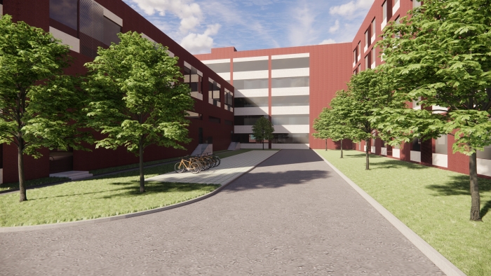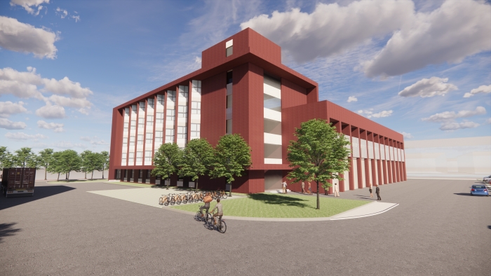 修改主要內(nèi)容為“一號(hào)生產(chǎn)樓”由L型修改為長(zhǎng)條形,西側(cè)部分取消,原3層改為5層。“廠房”在原有位置不變,向南側(cè)擴(kuò)增一層倉(cāng)庫(kù)與一號(hào)生產(chǎn)樓相接。兩幢建筑的外立面在延續(xù)原有立面元素的前提下,主色調(diào)由原來的米色改為更具現(xiàn)代感的深紅色,手法虛實(shí)結(jié)合,大方、現(xiàn)代。