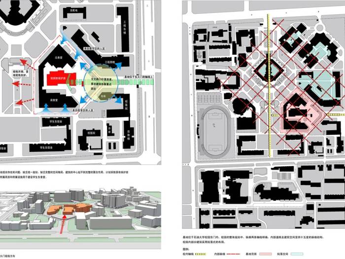 基地現狀存在的問題:缺乏統一規劃,缺乏完整的空間格局,建筑的空間起不到完整的聚合作用。尊重校園現有網絡體系,建立完整的空間秩序,提出“校園院落”的概念,使之成為校園的特色空間。