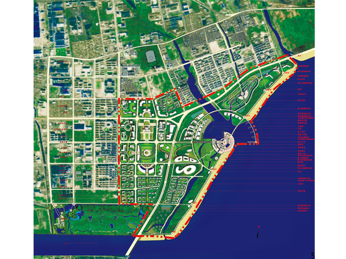 青島西海岸都市核心區城市設計控制性規劃方案,規劃面積為2.5平方公里,由水城及政府和新區兩部分組成,其規劃結構為“2軸4面”的結構,一條以政府大樓為中心的“行政軸”;一條沿深圳路向海洋發展的“海洋文化軸”;擋浪壩以東沙灘為第一個層面;公共沙灘面,海濱中央與擋浪壩之間為第二個層面;公共綠化地面;濱海中央路與海濱大道之間為第三個層面;海濱大道以西,以北為第四個層面。濱海中央路北段以旅游度假,高級居住區和海水浴場為主。度假酒店要與海水浴場鏈接方便,而海水浴場在空間上視線上保持一定距離。
