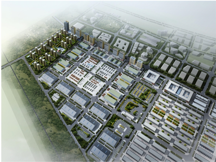 規劃方案充分考慮商貿經營、物流運輸使用要求并注重與自然地形有機結合,在現代實用理念的模式下,重視塑造一個科學、整潔、有序的商貿區,張弛有序的設計,構成豐富的空間層次。外圍商務辦公建筑注重城市景觀的塑造,創造出現代感的城市形象和舒適的城市空間,形成優美的城市輪廓線。