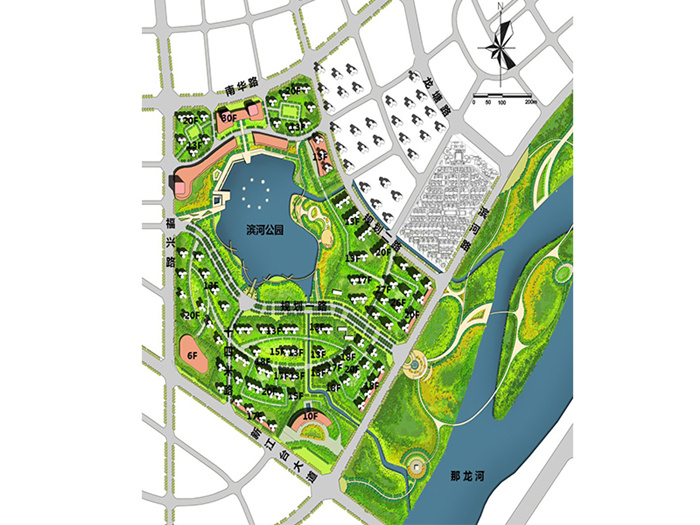 沿那龍河布置高層建筑,充分利用一線河景資源,使生態效益最大化,城市與生態" 共生"。