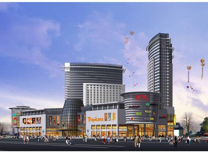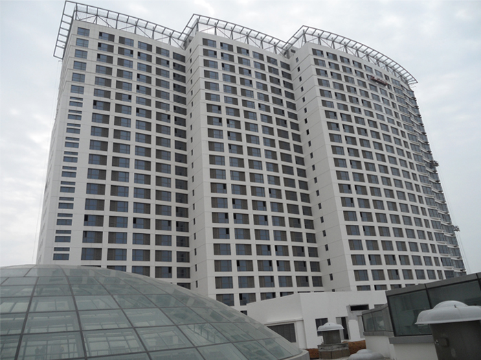 機動車停車庫,另有部分設備機房和酒店配套服務用房。地下二層及地下一層局部為人防。建筑長邊總長度199.19m,短邊總長度139.24m。購物中心位于1-5層,一層層高6.5m,其余層層高5.5m,建筑高度28.95m。主要功能包括商場(超市、家電賣場、百貨公司、精品店等),洗浴中心,電玩城,電影院,會議中心,宴會廳,餐飲等。酒店客房位于六6-22層,每層層高3.5m,總建筑高度89.500m,酒店其它配套服務用房(餐廳、宴會廳、會議中心、康樂健身中心、員工餐廳及休息室、洗衣房等)布置在地下2層-地上5層。度假式公寓位于6-27層,每層層高3m,總建筑高度95.850m。