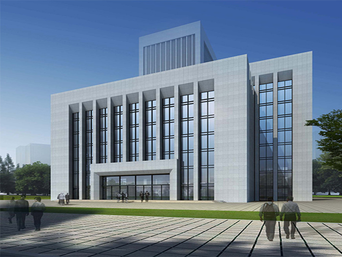 立面處理虛實結合,虛-- 結合豎條設置玻璃幕墻,賦予建筑現代氣質,實-- 以淺色花崗石為表皮肌理,結合整體視覺比例,局部加寬,增強建筑厚重感、穩重感。
