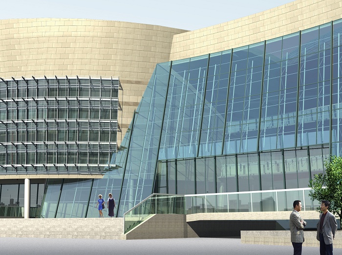 總體設(shè)計(jì)考慮用地位于丁字路口,呈三角形,館前要?jiǎng)?chuàng)造一定深度感的室外圍合空間,建筑物的體型要有利于創(chuàng)造這種空間,故采用了一字形的平面并作適當(dāng)?shù)慕ㄖ幚恚唤ㄖc北面聶耳文化廣場(chǎng)軸線中的聶耳雕像形成對(duì)景。