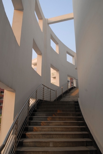 圖書(shū)館平面類似半圓形,弧形部分臨湖,直線部分面對(duì)教學(xué)樓和行政樓,為三層高建筑,主入口靠近教學(xué)樓,設(shè)于一層。平臺(tái)下局部設(shè)計(jì)為書(shū)庫(kù)和閱覽室。行政樓結(jié)合衛(wèi)生所設(shè)計(jì),共三層。其中一層為衛(wèi)生所,二、三層為行政辦公部分。行政辦公樓平面形式類似直角等邊三角形,等斜邊部分面對(duì)教學(xué)樓和圖書(shū)館,中部設(shè)計(jì)成弧形。食堂位于生活區(qū)中心,一期建設(shè)時(shí)為二層,二期建設(shè)時(shí)對(duì)食堂進(jìn)行了改擴(kuò)建,改建后局部為三層,總建筑面積由6126平方米增加至14733平方米。生活輔助區(qū)由學(xué)生宿舍(其中一部分可考慮為教工宿舍),一個(gè)綜合性食堂,以及浴室、鍋爐房組成,一期四棟宿舍呈折線型平面,二期擴(kuò)建時(shí)在食堂北側(cè)加建八棟學(xué)生宿舍。大、形成了更多語(yǔ)義。