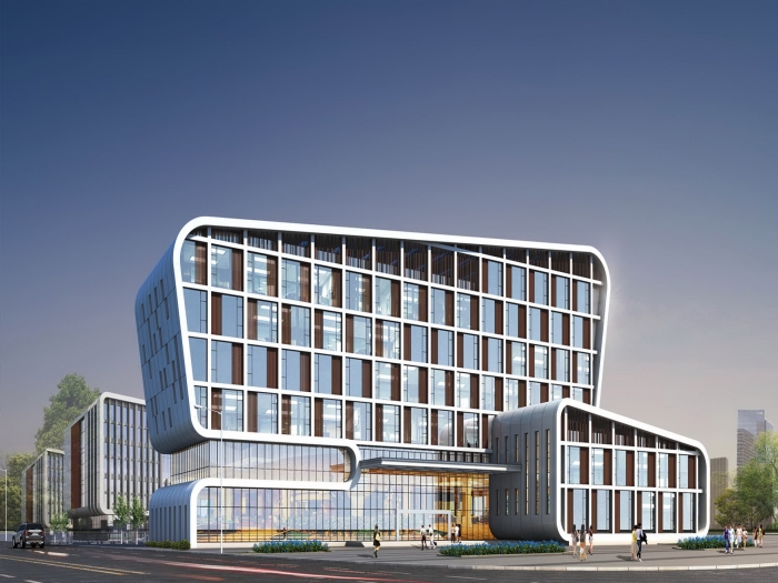 本地塊呈較為規則的矩形,但地塊內有兩條架空高壓線穿越,導致地塊北分割為不規則的兩部分用地,同時本項目用地分兩期征地,因此規劃設計時需綜合考慮項目實施的安全、經濟、合理等因素。項目主要是作為對電子、汽車零配件、五金等來料產品進行表面電鍍處理的工業廠房。由16棟電鍍廠房、1棟污水站、1棟研發辦公樓、1棟熱動力中心、5棟倉庫及2棟門衛等建筑組成。共分兩期建設,其中一期包括1棟研發辦公樓、8棟廠房及污水站、熱動力中心、部分倉庫等;二期也建設8棟廠房,以及部分倉庫。建筑外墻主要采用真石漆涂料+玻璃窗飾面,建筑外觀以現代、動感為主要風格。通過采用豎向線條及外框弧形邊角相結合處理,造型層次豐富;顏色以白色為主基調。