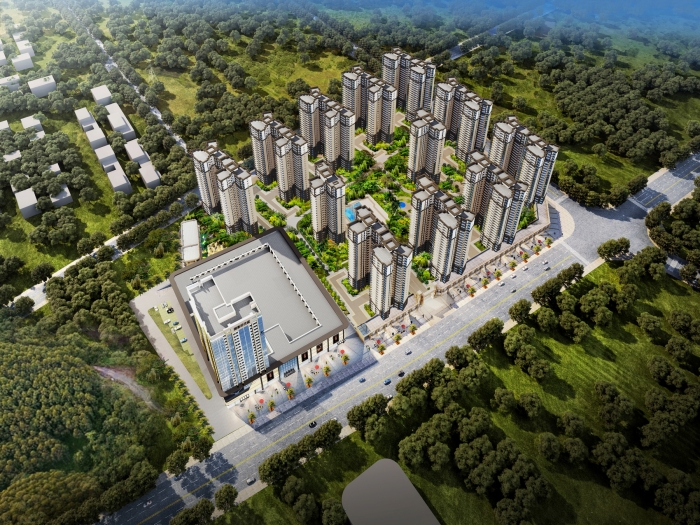 該項目注重建筑生態性以及合理有序與創新的設計原則,在總體規劃中沿用地邊線呈展開布局13棟高層住宅,另配套設置3層樓高的大型商場、1所幼兒園、兩層地下停車庫及配電房、垃圾收集房等設施;在總體內環境布局中利用環形道路設計出大型中心花園,在花園首層中布置公共架空層,并引入綠化景觀,形成更多元化的休閑空間。