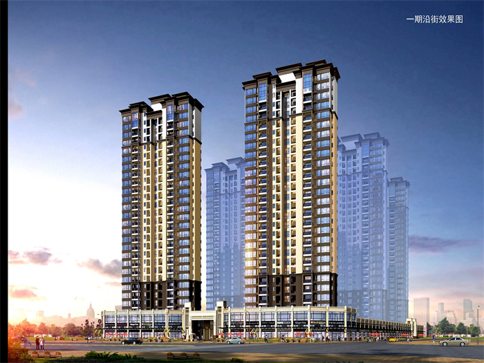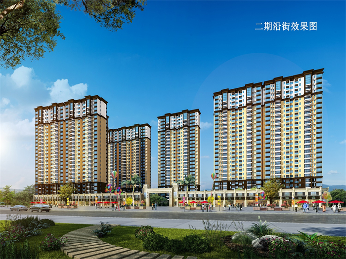 本項目結合地形及嶺南地區氣候特點,沿用地南北布置13棟住宅塔樓,建筑物均為南北朝向,首層沿用地四周設沿街商業配套用房,形成圍合庭院空間,營造出樓距充足、采光通風良好的戶型空間。