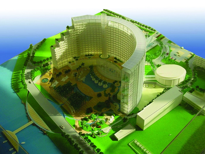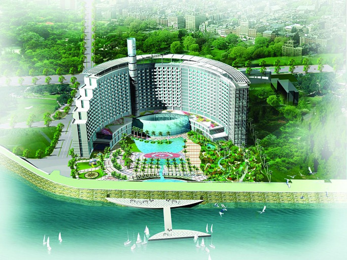 面對東江這樣的題目,如何讓每戶都可以看到江景是設計的關鍵,因此,我們采用橢圓形的構(gòu)圖,整個規(guī)劃控制在一個橢圓形的圖案之中,主體建筑則截取其中的一段,單側(cè)的走道,單側(cè)的客房,保證了戶戶看江。橢圓的其它部分或是走道、或是花架、或是伸向江中的碼頭。我們在一個沒有任何參照物的地塊上建立了秩序,有了設計的基本原則,接下來的設計便是順其自然了。在建筑造型設計上為避免過于對稱的呆板,主樓一側(cè)呈臺階狀層層向上,另一側(cè)則每3層架空,做空中花園,豎向的交通體突出于建筑之外,呈強勁的上升之勢與水平的陽臺構(gòu)成強烈的橫豎對比既是“破”,又是“立”,電梯間也有無敵的江景。歌舞廳置于酒店的南部,與酒店脫離,避免音樂的噪音對客人的干擾。景觀設計分區(qū)動靜,或中式、或西式,各有所愛。酒店大堂是設計的重點,恢宏的氣勢、宜人的服務、靜雅的茶室,處處傳遞出5星級酒店的尊貴與雍容。